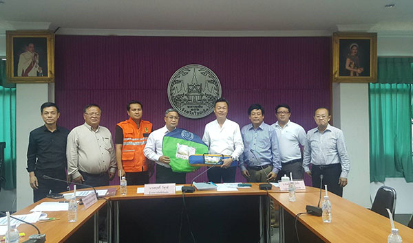 คุณทวี จงควินิต, คุณสุชาติ จงควินิต และผู้บริหาร บริษัท สยาม พาวเวอร์ ร้อยเอ็ด จำกัด เป็นตัวแทนบริษัทฯ มอบอุปกรณ์ยังชีพ : มุ้งกางครอบ และเต้นท์กางนอน
